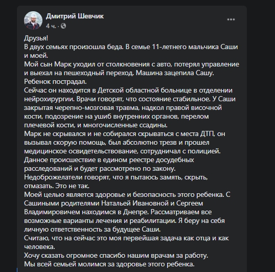 "Друзі! У двох сім'ях сталася біда. В родині 11-річного хлопчика Сашка і моїй. Мій син Марк уникав зіткнення з авто, не впорався з керуванням і виїхав на пішохідний перехід. Машина зачепила Сашу. Дитина постраждала. Зараз він знаходиться в Дитячій обласній лікарні у відділенні нейрохірургії. Лікарі кажуть, що стан стабільний. У Саші закрита черепно-мозкова травма, надкол правої скроневої кістки, підозра на забій внутрішніх органів, перелом плечової кістки, і численні садна. Марк не ховався і не збирався тікати з місця ДТП, він викликав швидку допомогу, був абсолютно тверезий і пройшов медичний огляд, співпрацював з поліцією. Подія в єдиному реєстрі досудових розслідувань, буде розглянута згідно із законом. Недоброзичливці кажуть, що я намагаюся зам'яти, приховати, відмазати. Це не так. Моєю метою є здоров'я і безпека цієї дитини. З Сашиним батьками Наталею Іванівною та Сергієм Володимировичем знаходимося в Дніпрі. Розглядаємо варіанти лікування і реабілітації. Я беру на себе особисту відповідальність за майбутнє Саші. Вважаю, що це моя найперша задача як батька і людини. Хочу сказати величезне спасибі нашим лікарям за роботу. Ми всією сім'єю молимося за здоров'я цієї дитини", - зазначив кандидат.
