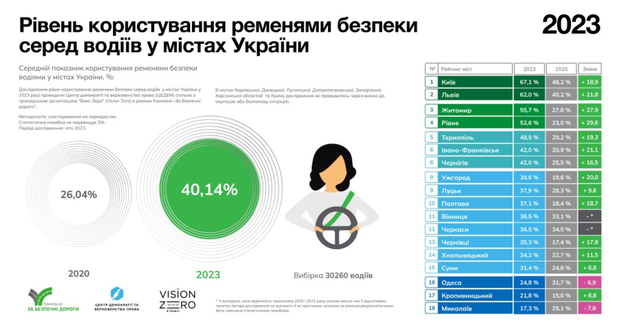 Примітно те, що разючі зміни зафіксували на рівні конкретних міст. У 2020-му не було виявлено жодного міста, де пасками користувалася більшість водіїв, а зараз таких налічується чотири: Київ, Львів, Житомир, Рівне. У двох останніх - пасками стали користуватися удвічі більше.