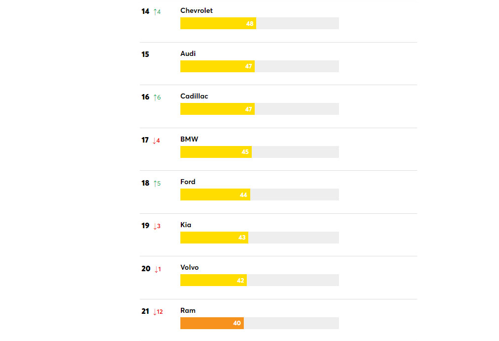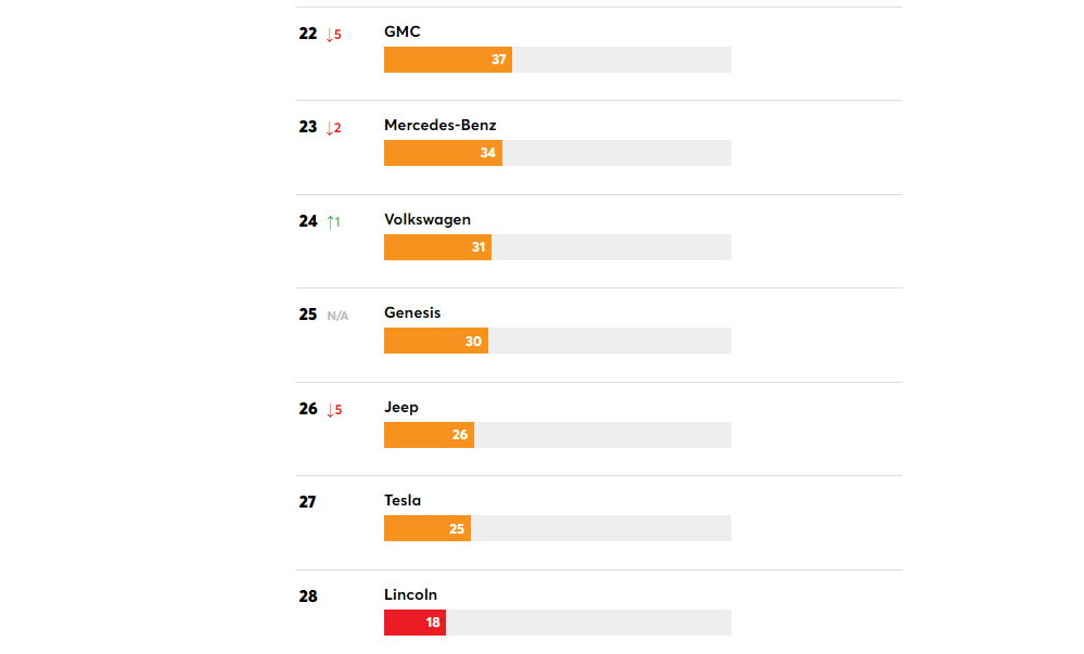 Згідно з ним, лідирує у списку автобрендів - Lexus. На другому та третьому місцях за надійністю - Mazda та Toyota. Замикають ТОП-5 - Infiniti та Buick. Дещо менш надійні: Honda та Subaru. Tesla перебуває на 27 сходинці.
