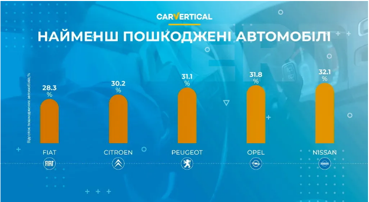 Найрідше в ДТП потрапляють моделі марки FIAT, Citroen і Peugeot. Це обумовлено тим, що велика частина моделей цих марок це компактні міські автомобілі малих потужностей.