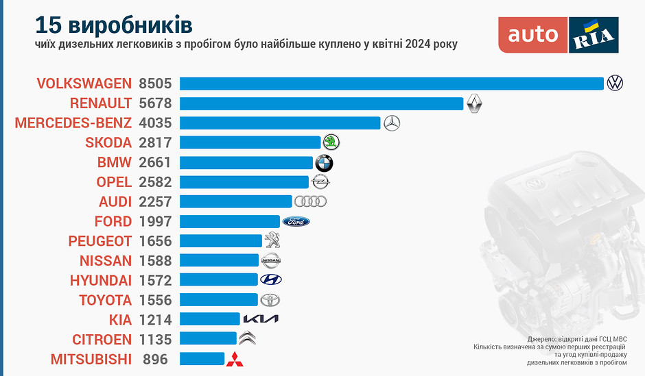Експерти склали рейтинг найбільш популярних марок дизельних авто на вторинному ринку України у квітні 2024 року.