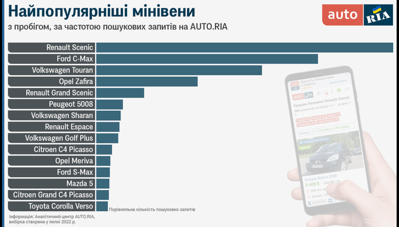 Рейтинг складено на основі найпопулярніших пошукових запитів на сайті. Так, найчастіше шукали Renault Scenic, а також Ford C-Max та Volkswagen Touran.
