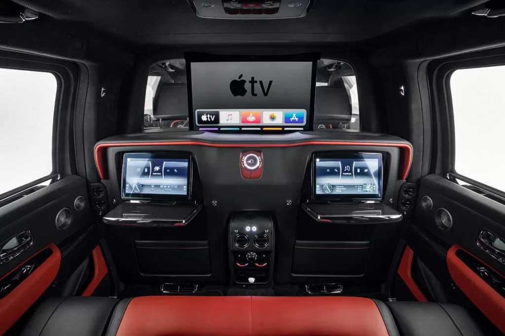 "Салон подовженого RR Cullinan став помітно просторіше, причому тюнери розмістили всередині перегородку зі склом, що опускається (як в повноцінних лімузинах). У неї вбудовані персональні столики і два невеликих монітора, а зверху можна висунути великий телевізор", - йдеться в повідомленні.