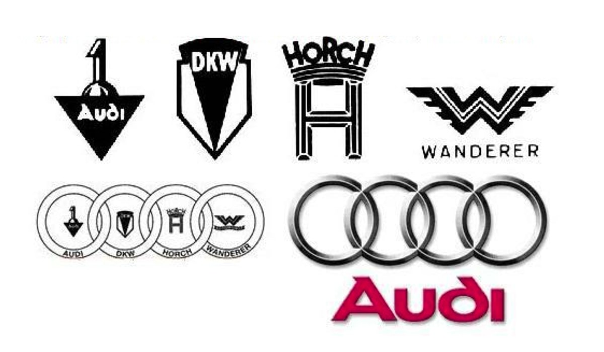 Зімкнуті кільця означають партнерство компаній Audi, Horch, Wanderer і DKW, які й заснували бренд. Спочатку лого Ауді використовувався тільки на гоночних машинах, а звичайні автомобілі кожна компанія випускала зі своєю емблемою. Але у 1932 році підприємства об'єдналися.