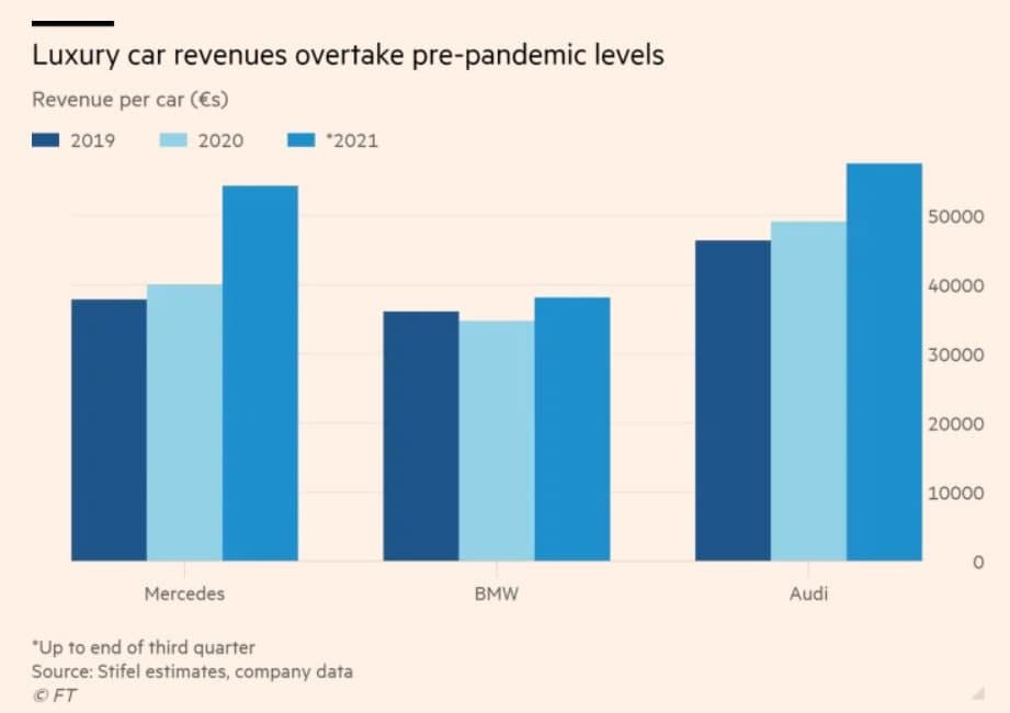 У результаті до кінця третього кварталу 2021 року виторг за один автомобіль Mercedes-Benz збільшився до 54 тис. євро у порівнянні з 38 тис. євро у 2019 році. Audi збільшила цей показник до 57,5 тис. євро із 46 тис. євро. BMW, яка не настільки скоротила своє виробництво, показала менш значне збільшення показника виторгу на автомобіль - до 38 тис. з 36 тис. євро.