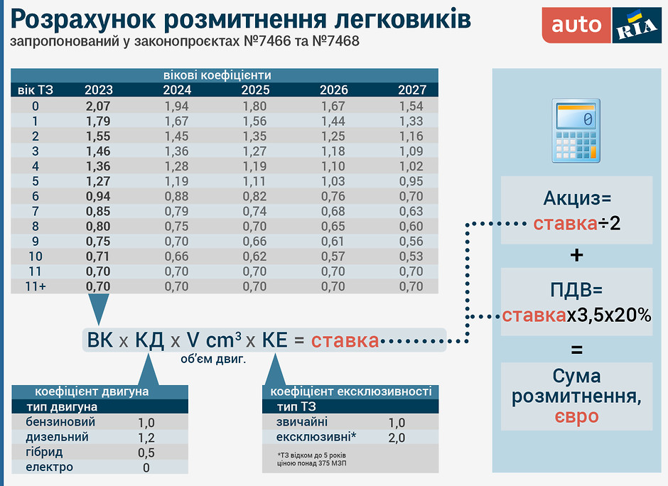 У розрахунку податку запровадять нову формулу замість зв"язки "мито+акциз+ПДВ", які залежать від оціночної вартості автомобіля. Формула обчислить суму платежів у залежності від типу, віку та об"єму двигуна автівки. При цьому її вартість не братимуть до уваги. Складові формули та відповідні коефіцієнти такі: