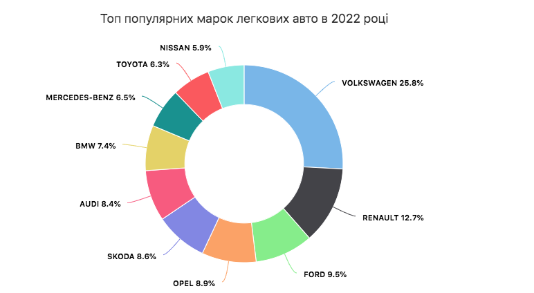 Найпопулярнішим брендом у 2022 році серед "легковушок" виявився Volkswagen. У трійку затребуваних машин потрапили також RENAULT і FORD. Статистика виглядає так: