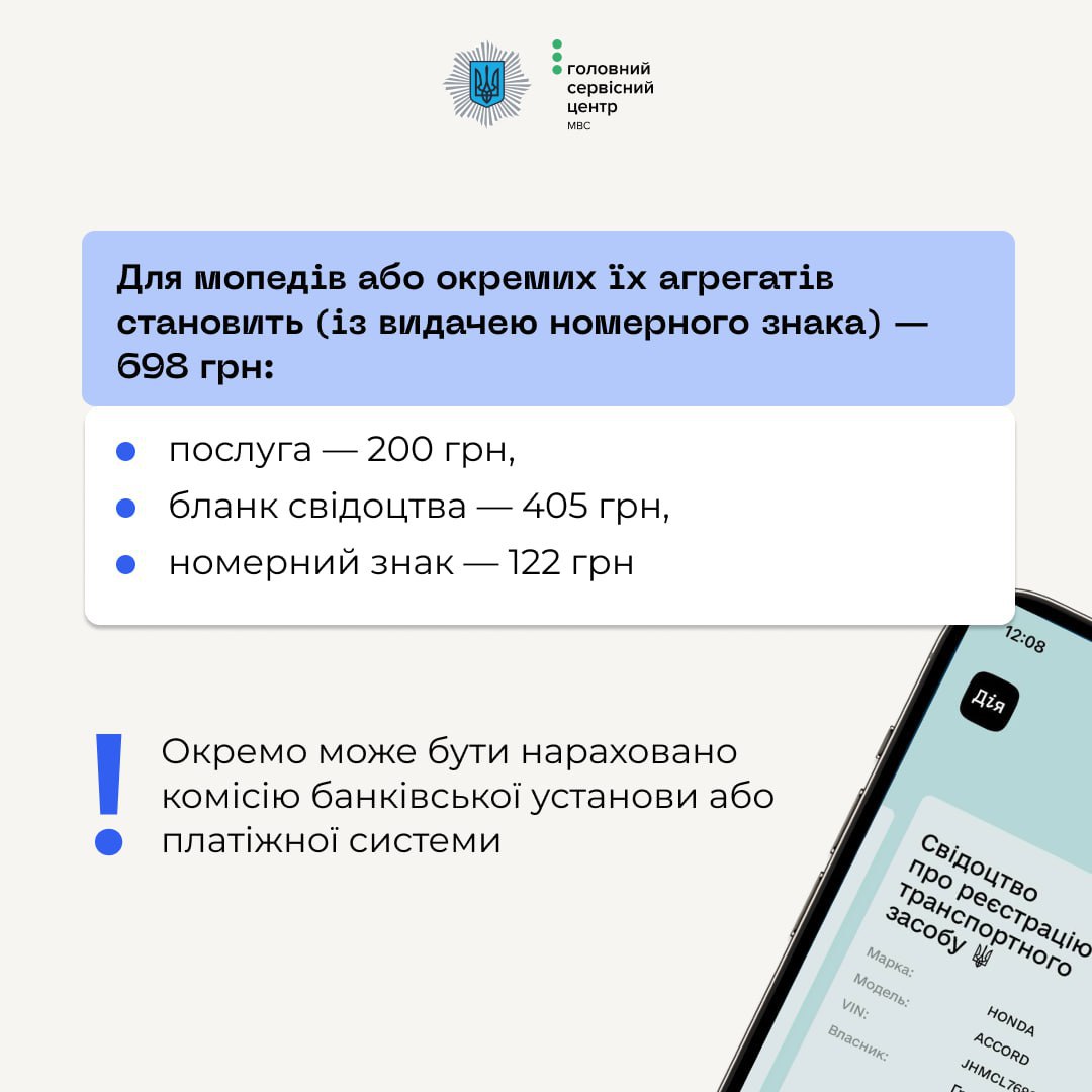 Для мопедів або окремих їх агрегатів складає (з видачею номерного знака) – 698 грн.