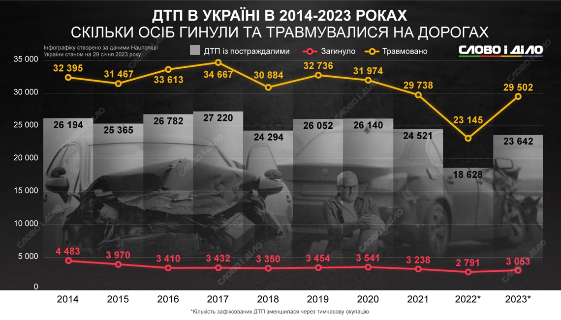 Так, за 2014 рік в Україні сталося понад 150 тисяч ДТП, у 26 тисячах 194 випадках загинули (4 тисячі 483) чи постраждали люди (32 тисячі 395).