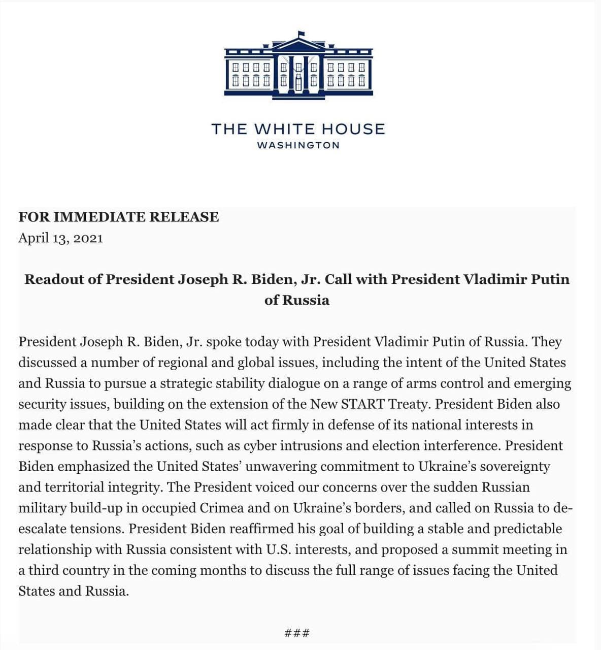 "Президент Байден підтвердив свою мету побудови стабільних і передбачуваних відносин з Росією відповідно до інтересів США і запропонував в найближчі місяці зустріч на вищому рівні в третій країні для обговорення всього спектру проблем, що стоять перед США і Росією", - йдеться в заяві.