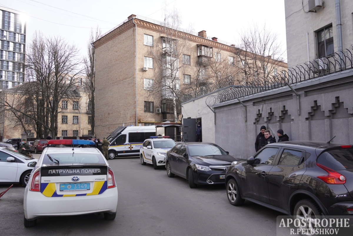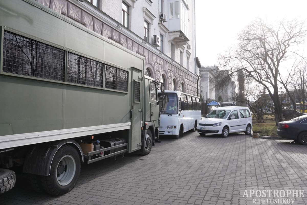Під будівлею стояло п'ять автобусів та п'ять патрульних авто спецпризначенців Нацгвардії та спецпідрозділу ТОР.