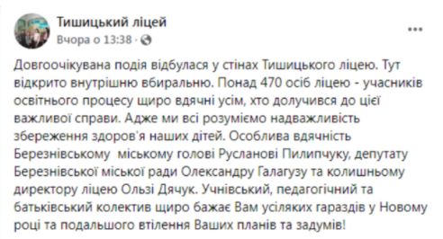 "Довгоочікувана подія сталася у стінах Тишицького ліцею. Тут відкрили внутрішній туалет. Понад 470 людей ліцею – учасників освітнього процесу щиро вдячні всім, хто долучився до цієї важливої справи. Адже ми всі розуміємо надважливість збереження здоров'я наших дітей", – йшлося у повідомленні.