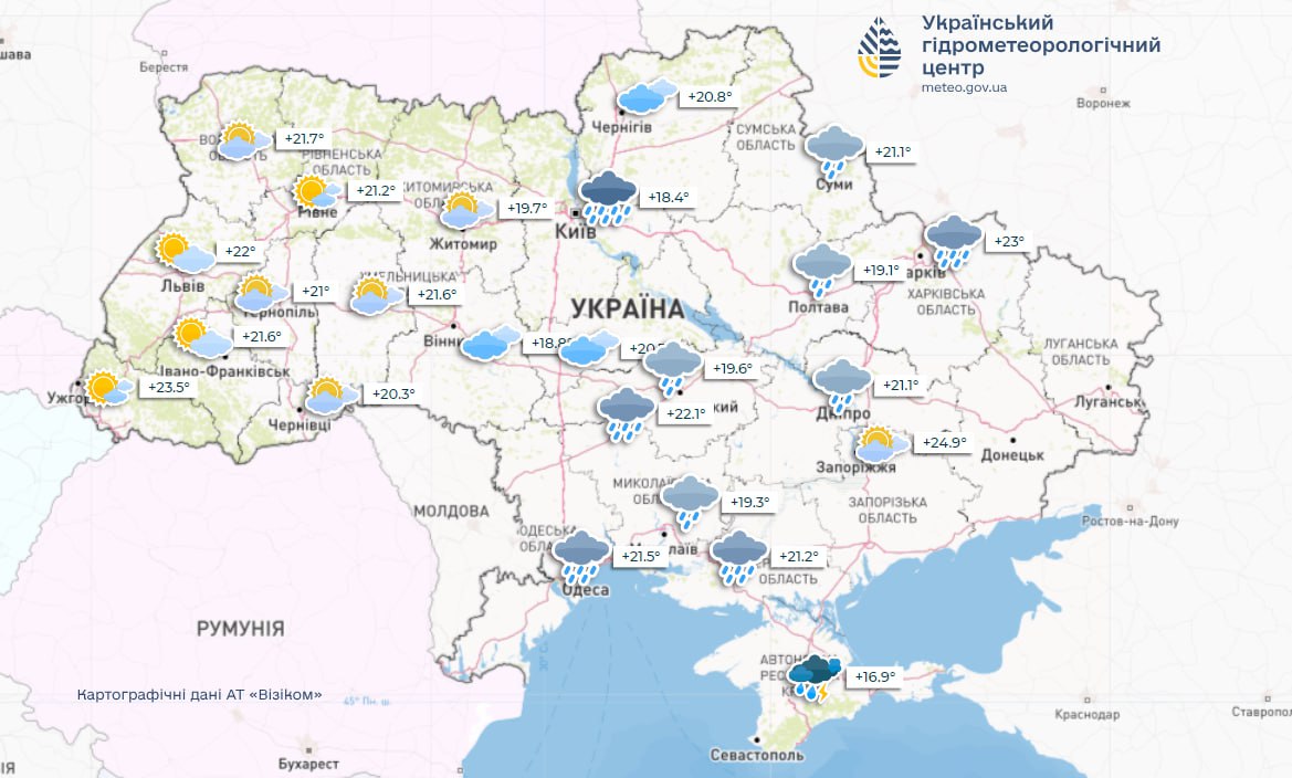 У неділю, 16 червня, у південних, центральних та східних областях грози, вдень в окремих районах град та шквали 15-20 м/с; у Харківській, Полтавській, Черкаській, Кіровоградській, Херсонській, Миколаївській, вночі у Дніпропетровській та Запорізькій областях дощ. Температура вночі +12-17°, у західних областях 8-13°; вдень +20-25°, у східних та південних областях +23-28°.