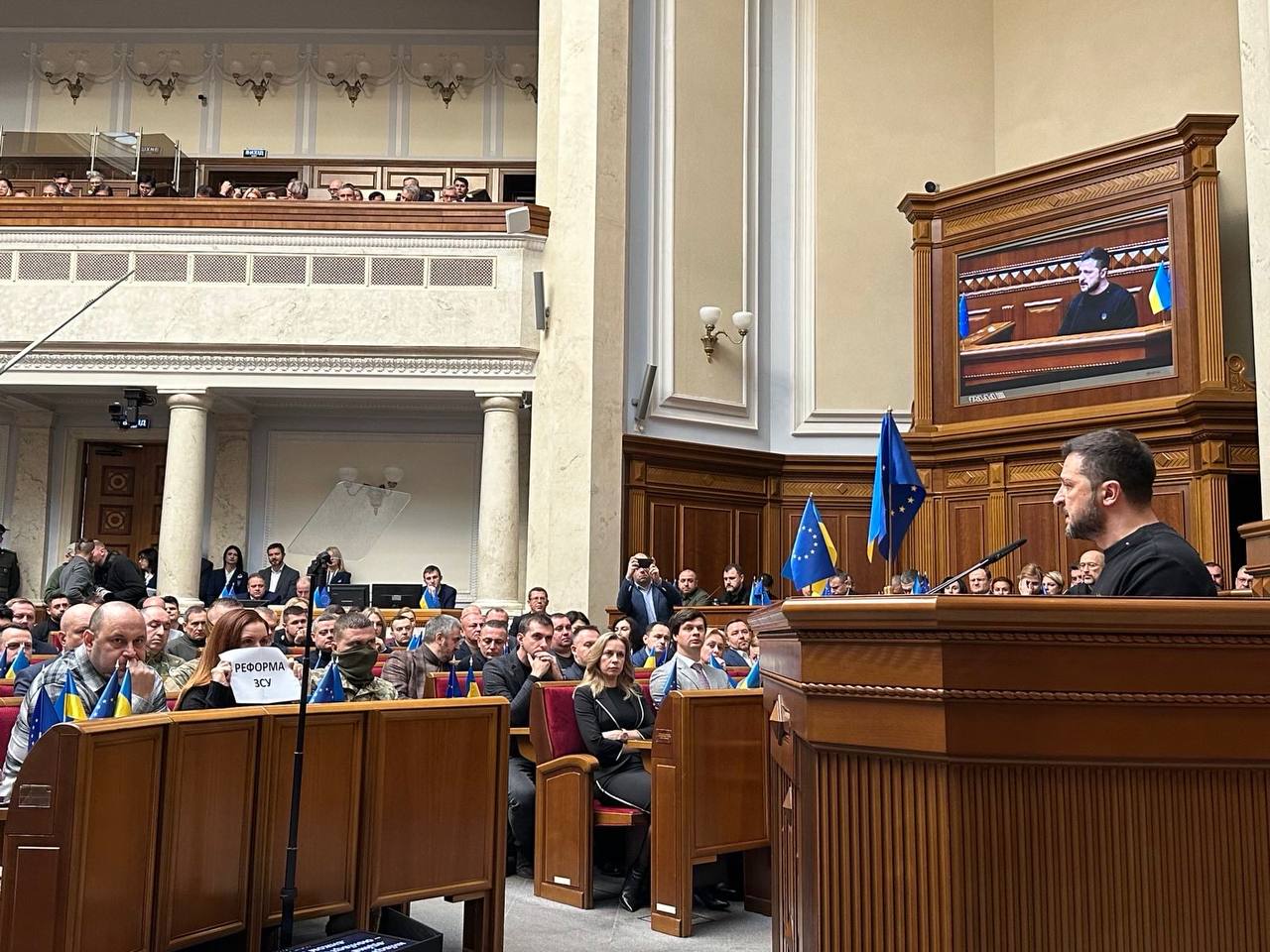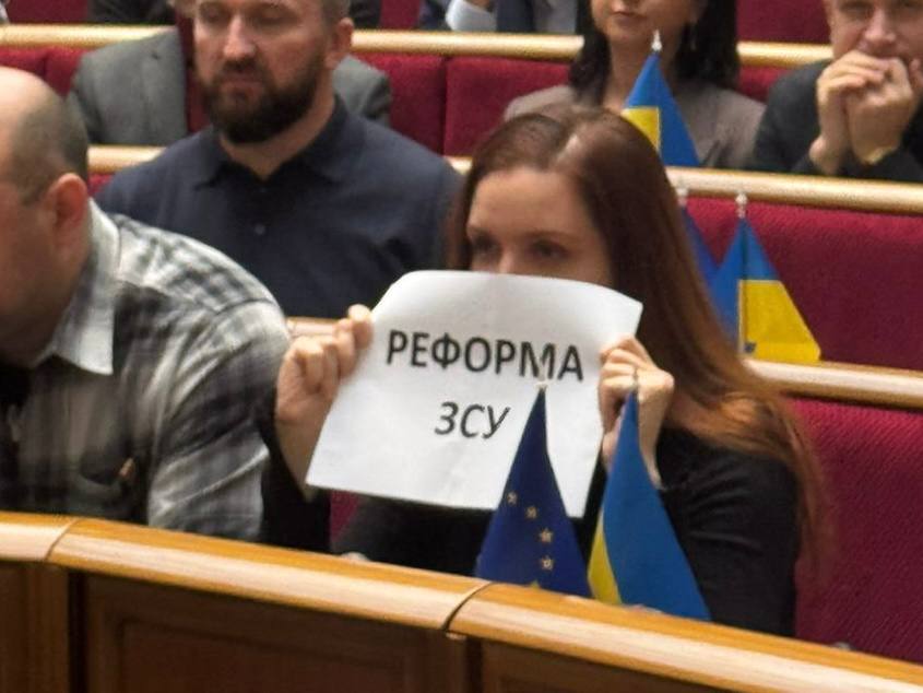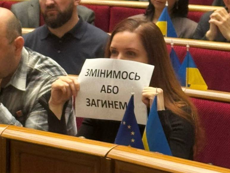 Під час представлення президентом України Володимиром Плану стійкості у Верховній Раді України народна депутатка Мар'яна Безугла влаштувала перформанс з плакатами.