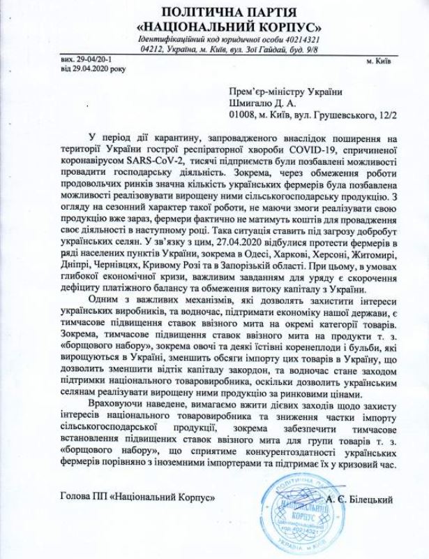 "Національний корпус" вимагає вжити заходів щодо захисту інтересів національного товаровиробника і зниження частки імпорту сільськогосподарської продукції. З таким зверненням до прем'єр-міністра Дениса Шмигаля звернувся лідер партії Андрій Білецький.