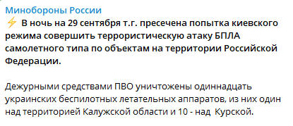 У ніч на 29 вересня невідомий безпілотник атакував електропідстанцію у Курській області РФ, внаслідок чого було знеструмлено п'ять населених пунктів.