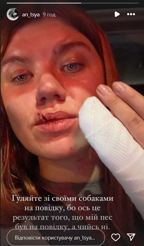 "...гуляв пес, який рвонув до мого і одразу напав, розбороняла і той пес мене покусав, питань до пса у мене немає, у мене питання до є**них власників які відпускають своїх собак отак гуляти, це сюр", - пише вона.