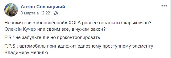 "Олексій Кучер, своїм все, а чужим закон? Не забудьте особисто проконтролювати. Автомобіль належить одіозному злочинному елементу Володимиру Чепілю", - написав він.