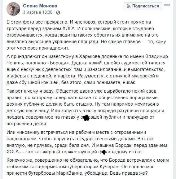 "Суспільство виробило звід правил, за яким здійснювати дії, що засуджуються публічно, має бути соромно. Як ось чиновнику зустрічатися на робочому місці з відвертими бандюганом, щоб покерувати державними справами. Машина Бороди перед будівлею ХОДА - це (знак зневаги) кожному з нас. Звичайно ж, зовсім не обов'язково, що "Борода" зустрічався з моїм улюбленим таксидермістом-губернатором Кучером. Він цілком міг принести бутерброди прибиральниці. Адже правда ж?", - зазначає Монова.