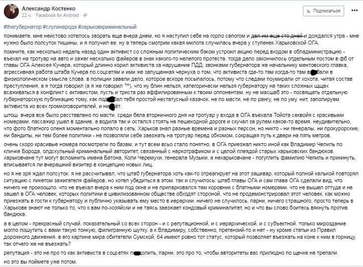 "Я не розраховував, що штаб губернатора хоч якось відреагує на новий зашквар, який повною калькою повторював ситуацію з пікетом палія фаєрів. Так і сталося: штаб голови ОДА і сам глава ОДА зробили вигляд, що нічого не сталося. Що не в'їхав до них під вікна і не припаркувався там корівник з блатними номерами. Що не вийшла звідти і не зайшла в ОДА людина, яких політики в цивілізованому суспільстві обходять стороною. Що не продемонструвала ця людина, як можна приїжджати в гості до губернатора і публічно вказувати йому місце в ієрархії. Нічого не сталося, хлопці, просто тепер в Харкові знають не тільки те, що до вас по-господарському і не криючись заїжджає кондовий криміналітет, а й що ви слово боїтеся вякнути проти бандюка", - написав Костенко.