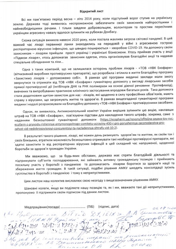 "Така допомога стала додатковим щитом для нас - лікарів, щодня в силу професійних обов'язків, що мають справу з вірусами. Медики і далі розраховували на благодійну допомогу від ТОВ НПК "Екофарм" у вигляді противірусних засобів. Однак, як виявилося, Антимонопольний Комітет України вирішив зупинити цю акцію, наклавши штраф на ТОВ НПК "Екофарм". Подібні рішення АМКУ шкодять консолідації зусиль суспільства в боротьбі з пандемією і тому неприпустимі", - впевнені медпрацівники, які підписали Відкритий Лист київських лікарів.
