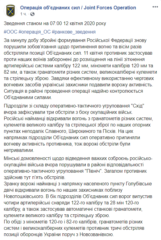 Уточнюється, що за добу українські військові поранили 7 російських найманців, але протистояння не припинилося. У ніч на 12 квітня бойовики обстріляли з ручних протитанкових гранатометів і кулеметів великого калібру українські позиції поблизу села Тарамчук на Приазов'ї, але провокацію припинили вогнем сили ООС.