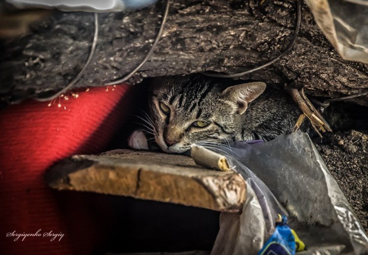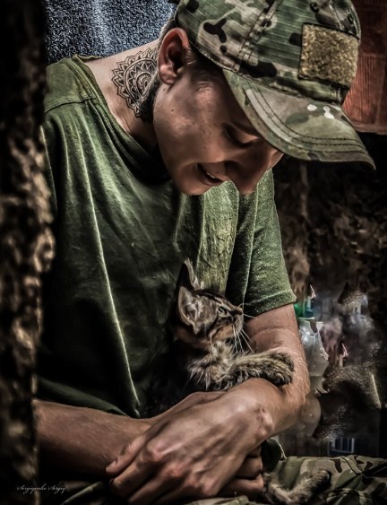 Так, на одному з фото дівчина-військова тримає на руках зовсім маленького кошеняти, на другому військовослужбовець гладить кота-підлітка, а на третьому тварина просто відпочиває на дерев'яних дошках десь в окопах.