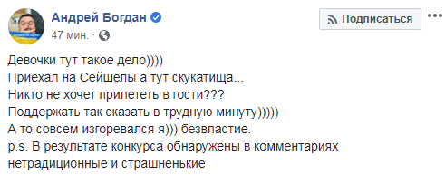 "Дівчатка тут така справа)))) Приїхав на Сейшели а тут скукатіща... Ніхто не хоче прилетіти в гості??? Підтримати так би мовити в скрутну хвилину))))) А то зовсім згорьований я))) безвладдя. P.s. Внаслідок конкурсу виявлені в коментарях нетрадиційні і страшненькі", - написав екс-політик, а також розмістив фото.