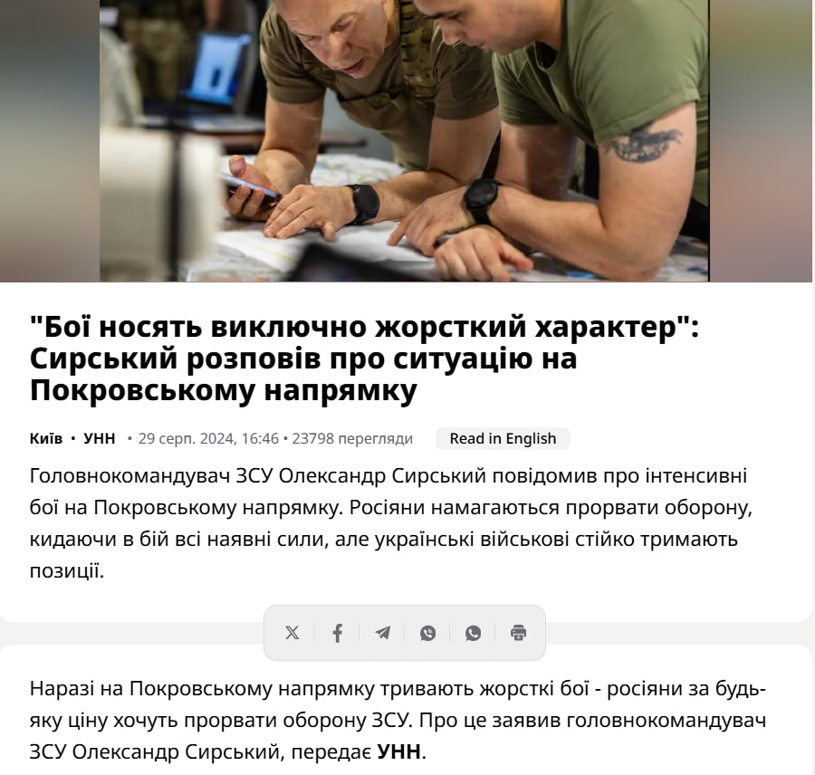 Слід звернути увагу, що комунікаційники Сирського використали частково ті самі фрази з повідомлення про Покровський напрямок від серпня 2024 року: