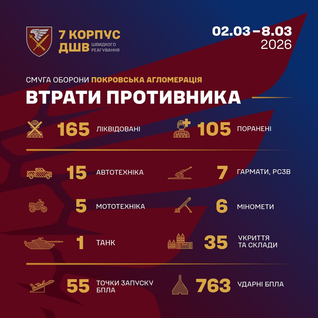 За цими даними, підрозділи сил оборони руйнують плани ворога: лише за попередній тиждень було ліквідовано та поранено близько 270 російських військових, збито або примусово посаджено 763 ударні дрони.