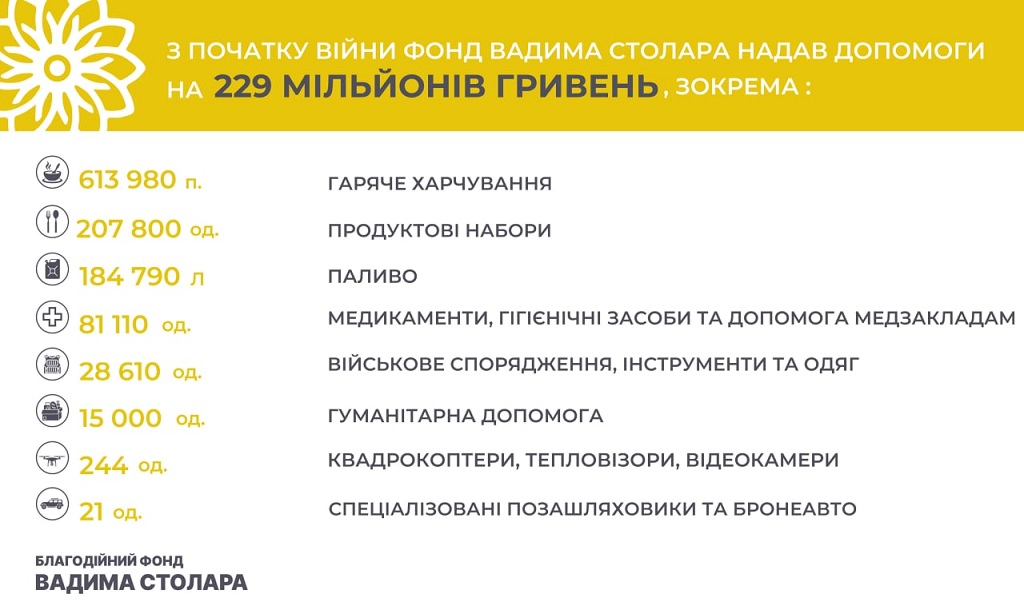 Загалом з початку повномасштабної російської агресії Фондом Вадима Столара разом із засновником було надано допомоги на 229 млн грн.