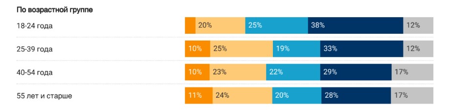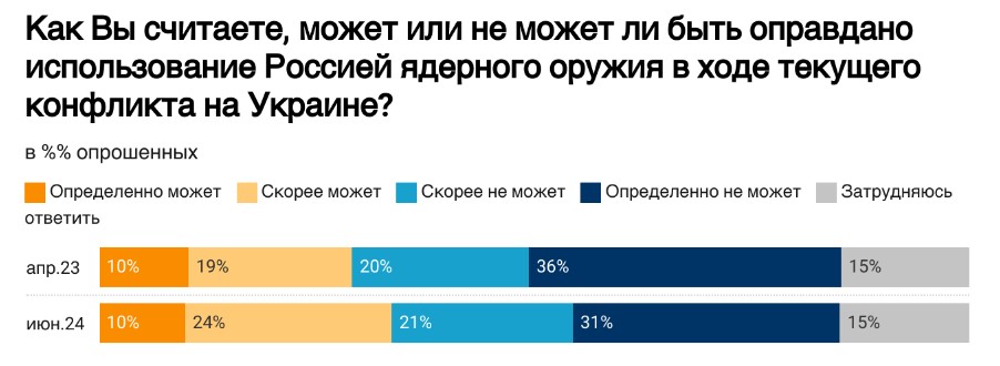 Цікаво, що думка щодо застосування ядерної зброї приблизно однакова як у молодих, так і у літніх росіян: різниця у кількості прихильників та противник лише кілька відсотків.