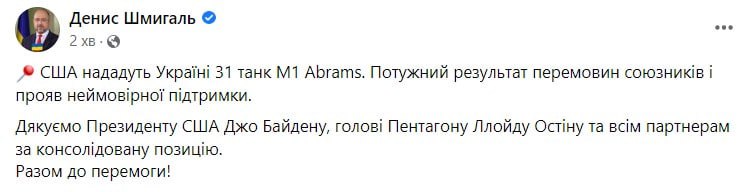 Прем'єр-міністр Денис Шмигаль відзначив, що це рішення є потужним результатом перемовин союзників і проявом неймовірної підтримки.