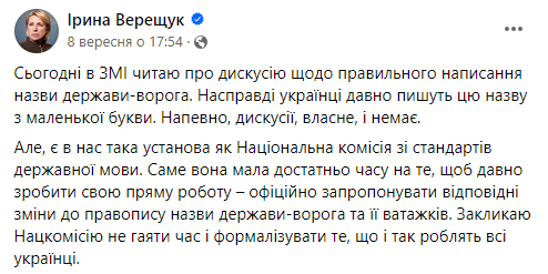 Зазначимо, що раніше віце-прем'єр-міністр – міністр з питань реінтеграції тимчасово окупованих територій України Ірина Верещук закликала Нацкомісію офіційно запропонувати зміни до правопису назви держави-ворога та її ватажків.