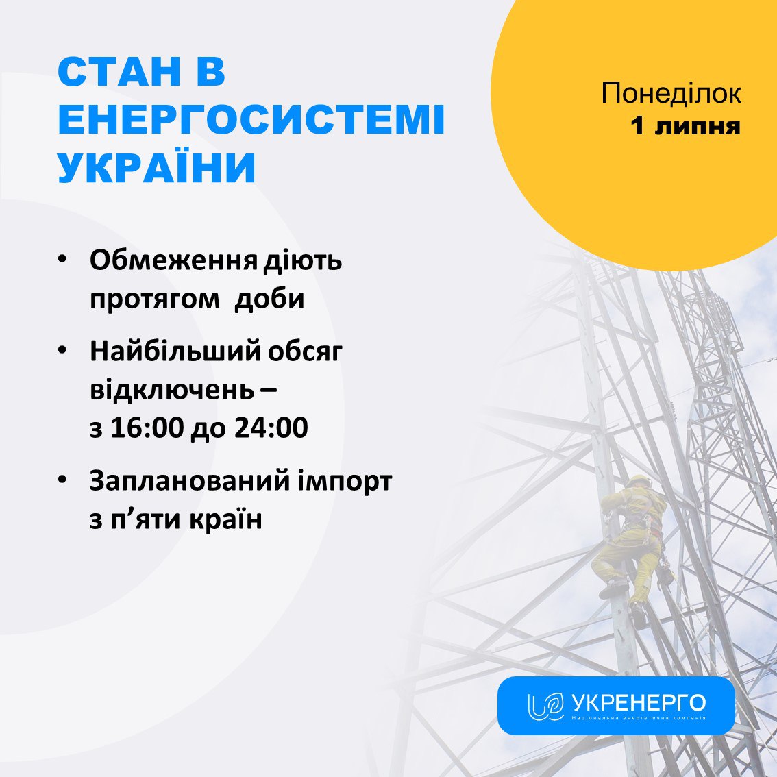 В понеділок, 1 липня, графіки відключення світла діятимуть протягом дня, проте в період з 16:00 до 24:00 очікується найбільший обсяг відключень.