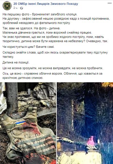 "На першому фото - бронежилет загиблого хлопця. На другому - зафіксований нашою розвідкою кадр з позицій противника, зроблений незадовго до фатального пострілу. Так, вам не здалося. На фото - дитина. Маленька дівчинка грається, поки ворожий снайпер працює. Чи знає противник, що ми не зробимо жодного пострілу, поки, навіть теоритично, дитина може бути наражена на небезпеку? Очевидно, так. Чи користується цим? Бачите самі", - йдеться в повідомленні.