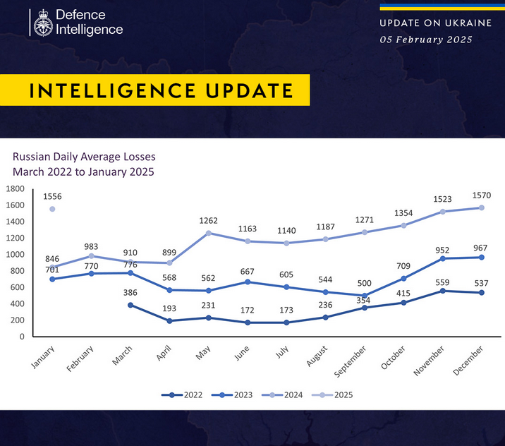 Британська розвідка прогнозує, що у лютому 2025 року збережеться високий рівень втрат серед російської окупаційної армії через інтенсивність наступальних операцій.