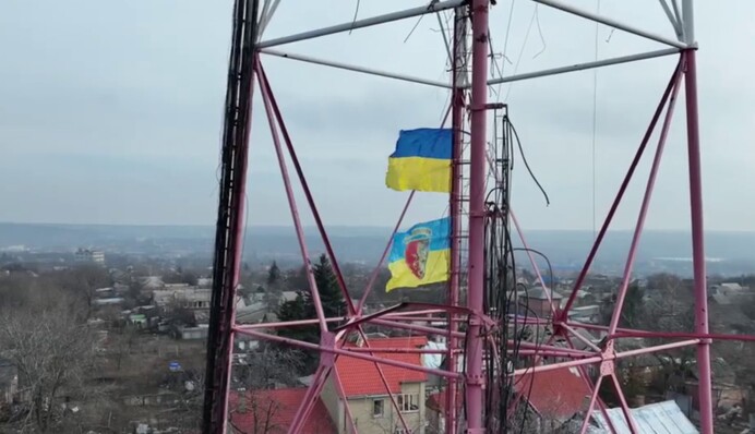 Прапор України воїни підняли над телевежею у Бахмуті. Також у відео лунають звуки вибухів.
