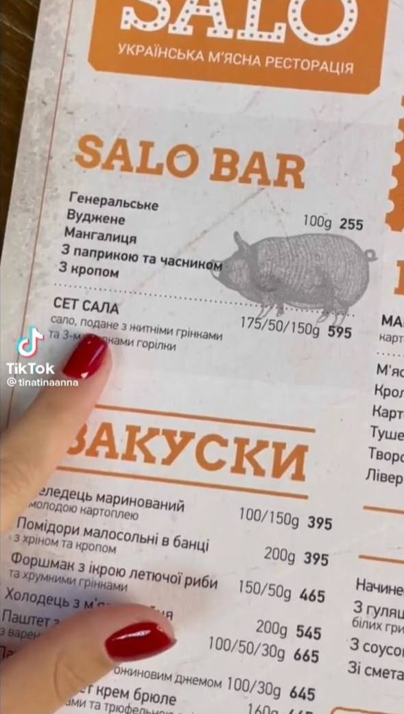 Користувачі соцмережі показали меню та ціни у кількох ресторанах. Вартість страв дивує. Так, наприклад, в одному із закладів сет салат коштує 595 гривень, деруни з гуляшем з кабана - 550 гривень, шашлик зі свинячого ошийка - 755 гривень, салат із капусти та моркви - 270 гривень.