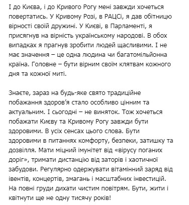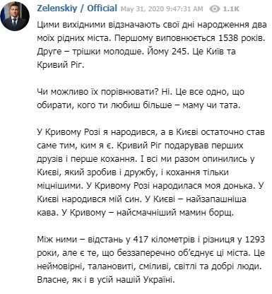 "Кривий Ріг подарував перших друзів і перше кохання. І всі ми разом опинилися в Києві, який зробив і дружбу, і любов тільки міцніше. У Кривому Розі народилася моя дочка. У Києві народився мій син. У Києві - найзапашніша кава. У Кривому - смачний мамин борщ", - написав гарант.