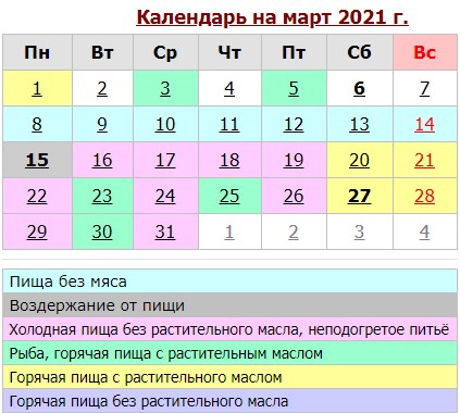 Так, в цьому році на березень випадає Вселенська поминальна субота (6 березня), останній день Масляної і Прощена неділя (14 березня). Також в першому місяці весни починається Великий піст (з 15 березня по 1 травня).