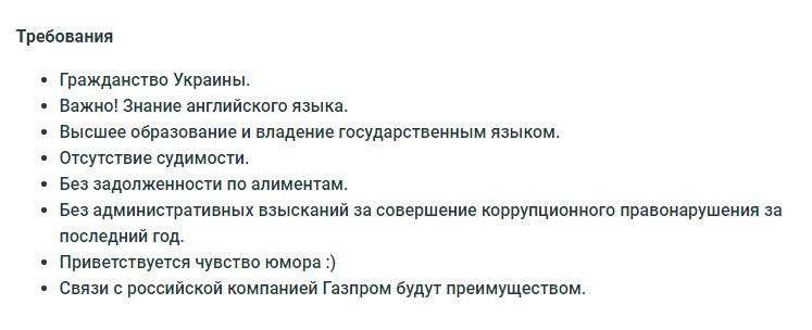 В якості вимог зазначено відсутність боргів по аліментах і стягнень за корупційні правопорушення "за останній рік". Також перевагами назвали почуття гумору і зв'язки з "Газпромом".