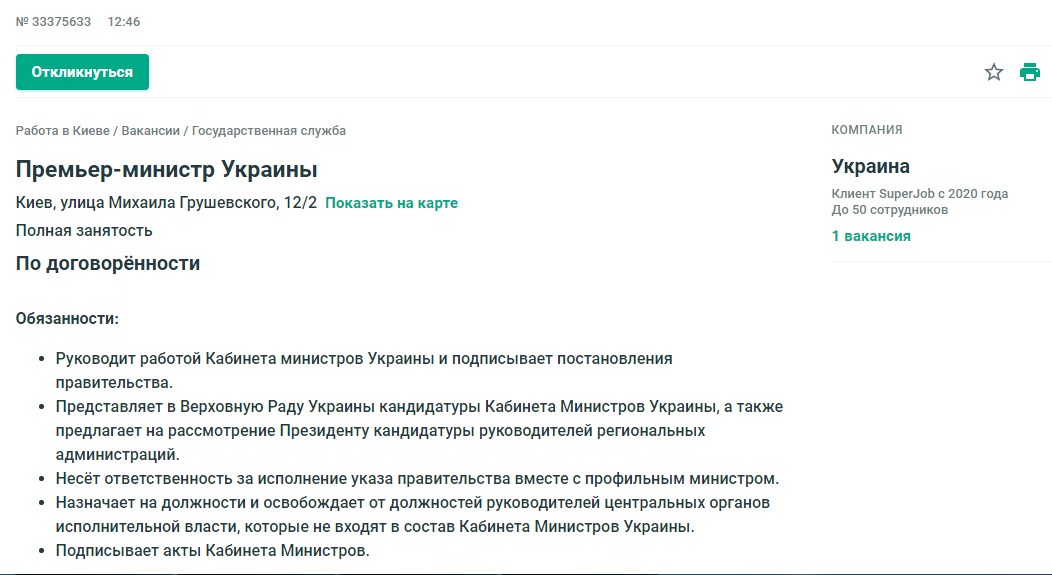 На популярному сайті по пошуку роботи в Україні з'явилася вакансія "прем'єр-міністра України", компанія, яка розмістила вакансію, називається "Україна".