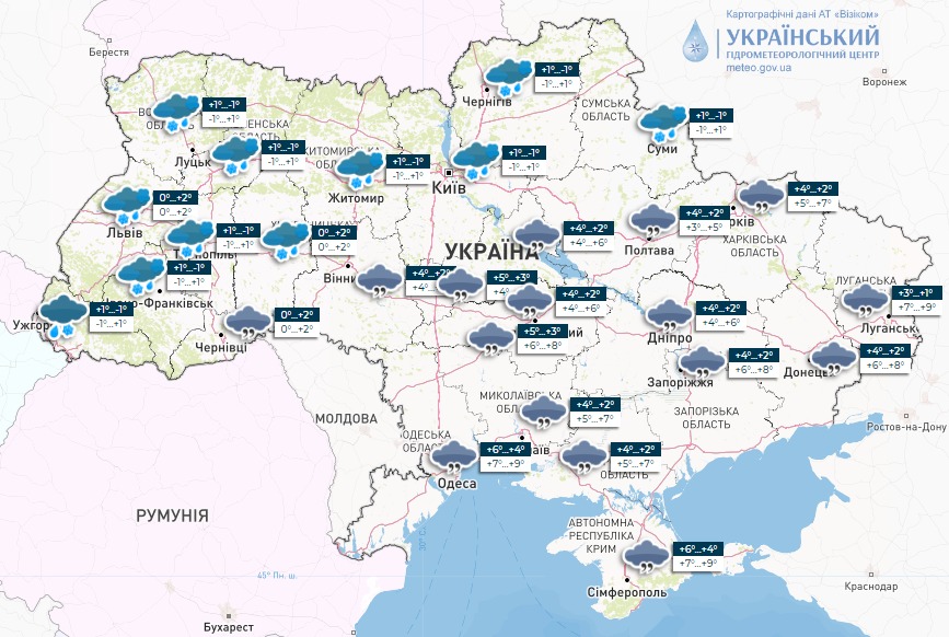 Вітер очікується західний, північно-західний зі швидкістю 7-12 м/с та періодичними поривами 15-18 м/с, а температура повітря становитиме -2...+3 градуси.