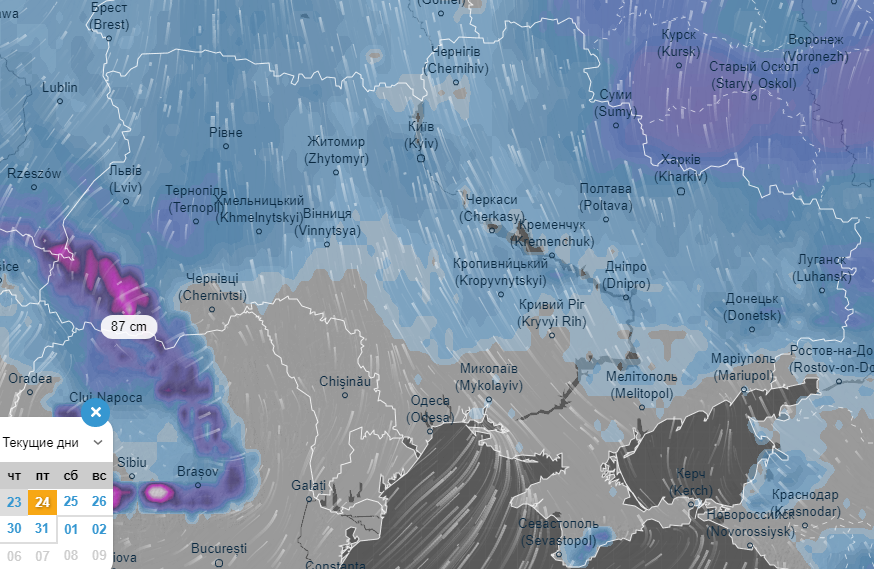 Так, вранці 24 грудня висота снігового покриву сягне 80-87 сантиметрів у західних та північно-західних регіонах, а також у Житомирі, Вінниці та Хмельницькому. На решті території сніговий покрив спостерігається скрізь від двох до п'яти сантиметрів.