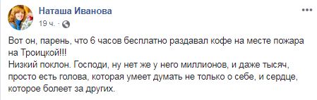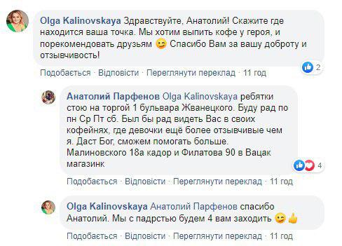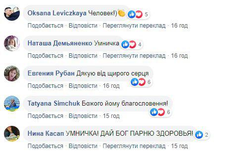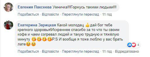 "Ось вчинок справжнього мужика, і про це треба розповідати нашим дітям, щоб знали, хто справжні герої. Спасибі, тобі, синку", "У людини є душа і голова на плечах", "Це дивно в наш час! Хай Бог допомагає тобі, здоров'я тобі і успіхів у всьому", "Зате у влади ні співчуття, ні допомоги. Нічого", "Читала, який молодець цей бариста! Дуже порядна людина! Низький уклін йому! Він на біді не заробляє. А "воділи" в мороз можуть проїхати повз дитину і не зупинитися"," В сюжеті новин по телевізору, розплакалася саме коли показали його, красавчик ", "Таких дітей слід в керівництво! Володарів великого серця, а не великих кишень з мільйонами ", - пишуть в коментарях.