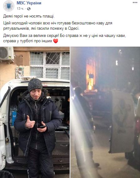 "Деякі герої не носять плащі. Цей молодий чоловік всю ніч готував безкоштовно каву для рятувальників, які гасили пожежу в Одесі", - йдеться в повідомленні.