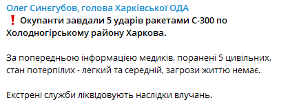 До того голова Харківської ОДА Олег Синєгубов повідомляв, що окупанти вдарили по Харкову ракетами С-300.