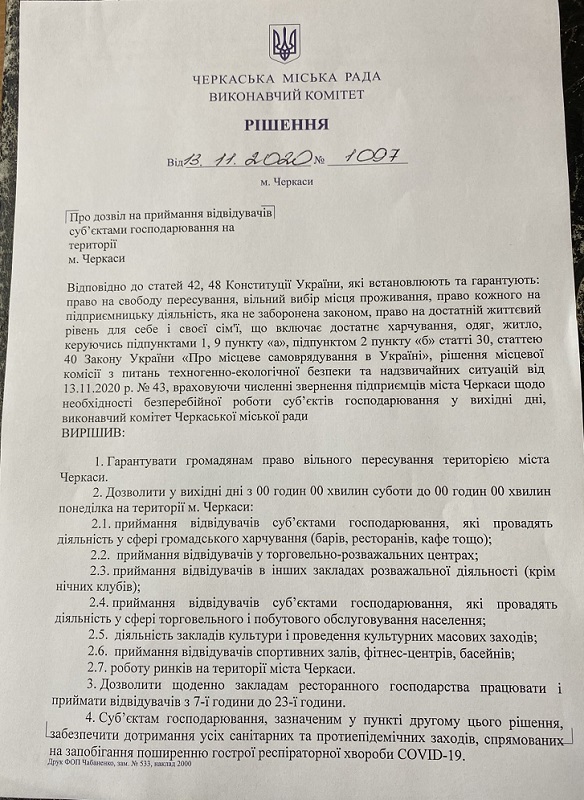 Рішення про не введення в Черкасах карантину вихідного дня спочатку прийняла комісія ТЕБ та НС, а потім затвердив виконавчий комітет.