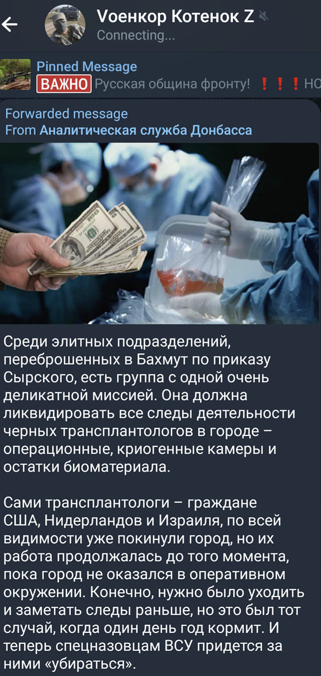 Боєць опублікував скріншот зі сторінки Telegram відомого російського "військора" та пропагандиста Юрія Котенка: той пише, що до Бахмута у складі ССО ЗСУ нібито зайшли підрозділи "чорних трансплантологів".